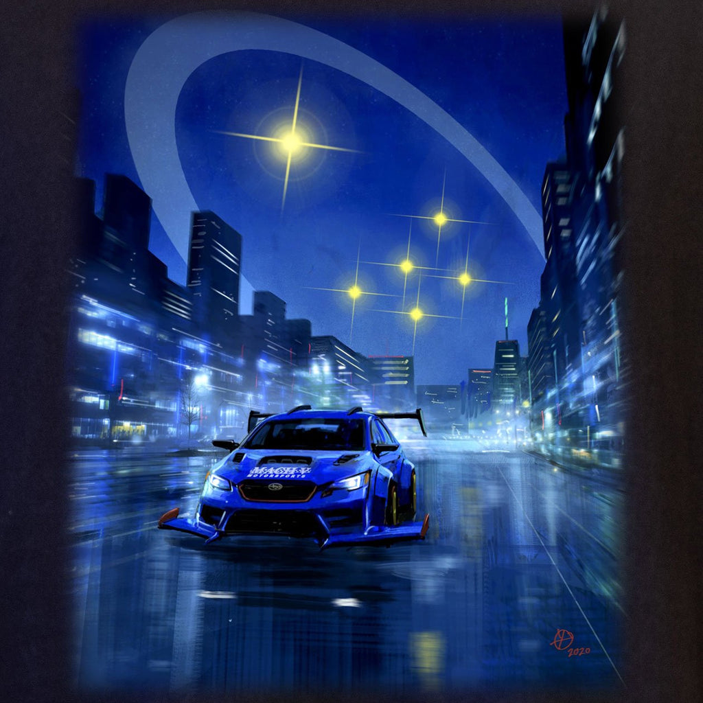 We don't know exactly what the future of Subaru performance looks like, but if you ask us it's going have a big flared fenders, a prominent hood scoop and some big wings. We tasked concept artist Donald Yatomi with bringing our ideas to life, and he painted this amazing image, complete with our high-performance boxer-powered supercar of the future blasting through an urban landscape, six stars reflected in the wet pavement.